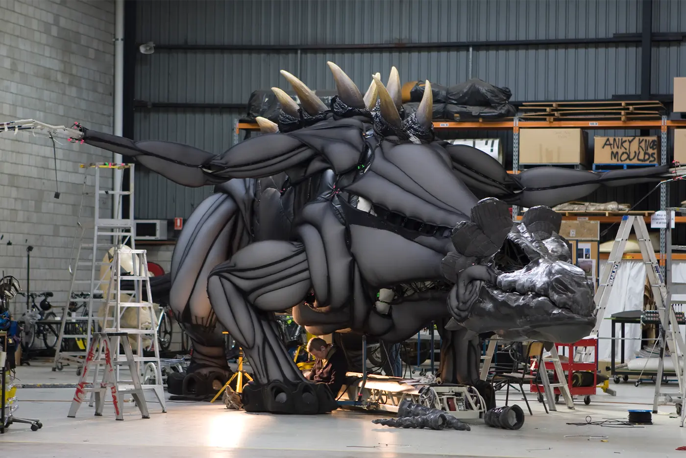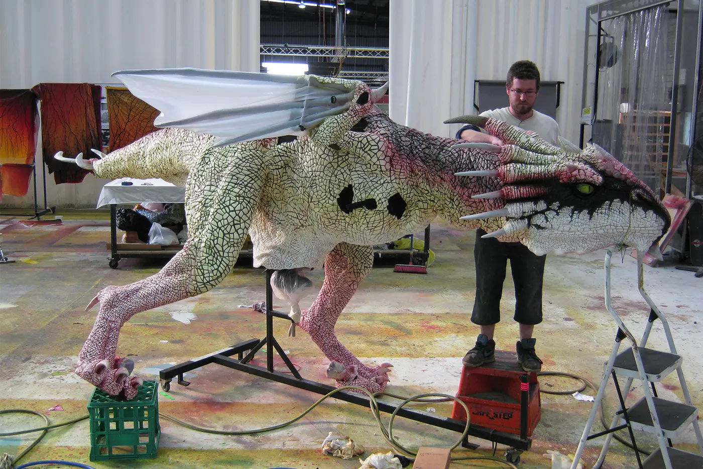 Working closely with Creature Designer Sonny Tilders and the Creature Technology Company, 24 dragons of 10 different species were brought to life, many operated by remote-controlled ‘voodoo puppeteers.’ The dragons interacted with actors, acrobats, and circus performers immersed in a world brought to life by video projections and sophisticated animation software. The production featured flying, stunts, fire, and pyrotechnics, all combining to deliver one of the largest and most technically ambitious theatrical arena productions ever staged at the time, which required an unprecedented 40 semi-trailers just to tour across Australia.