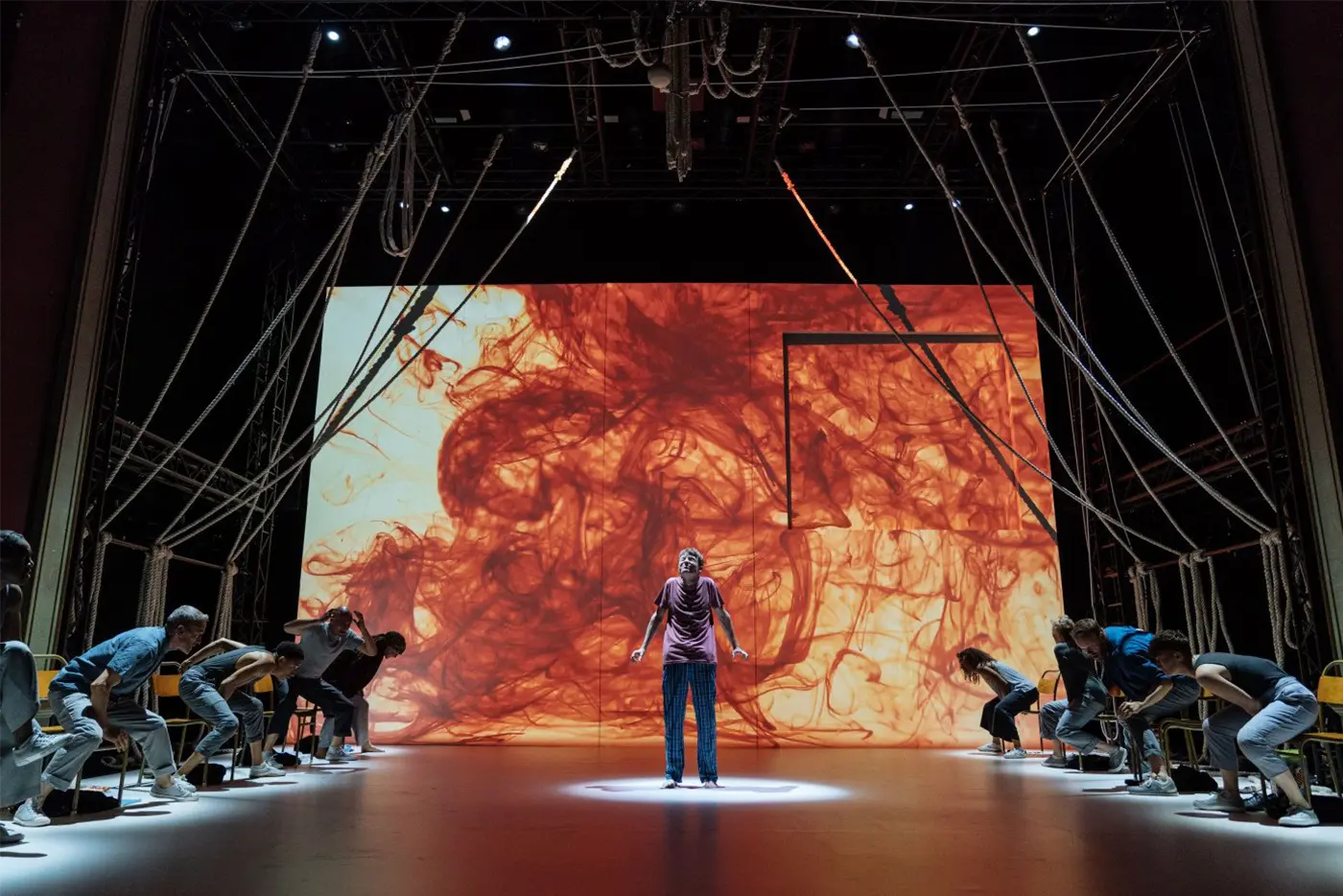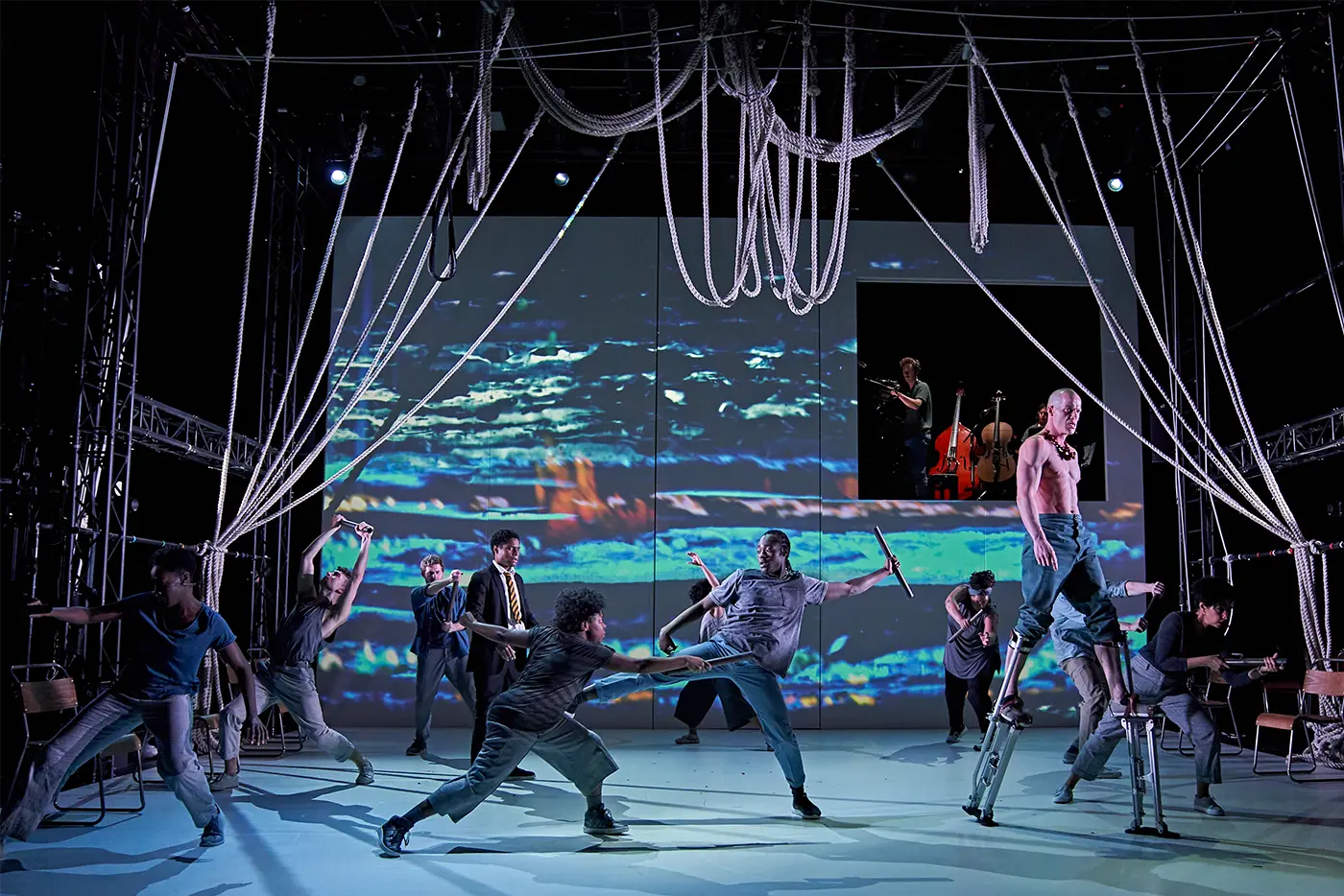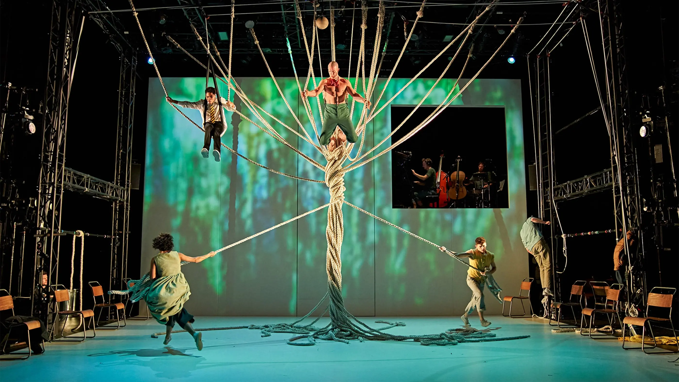 A theatrical performance featuring people interacting with a web of suspended ropes on a stage, with one person in a school uniform at the center and others in casual clothing pulling the ropes; chairs are scattered around, and a screen in the background shows musicians playing cello and double bass under dramatic lighting.
