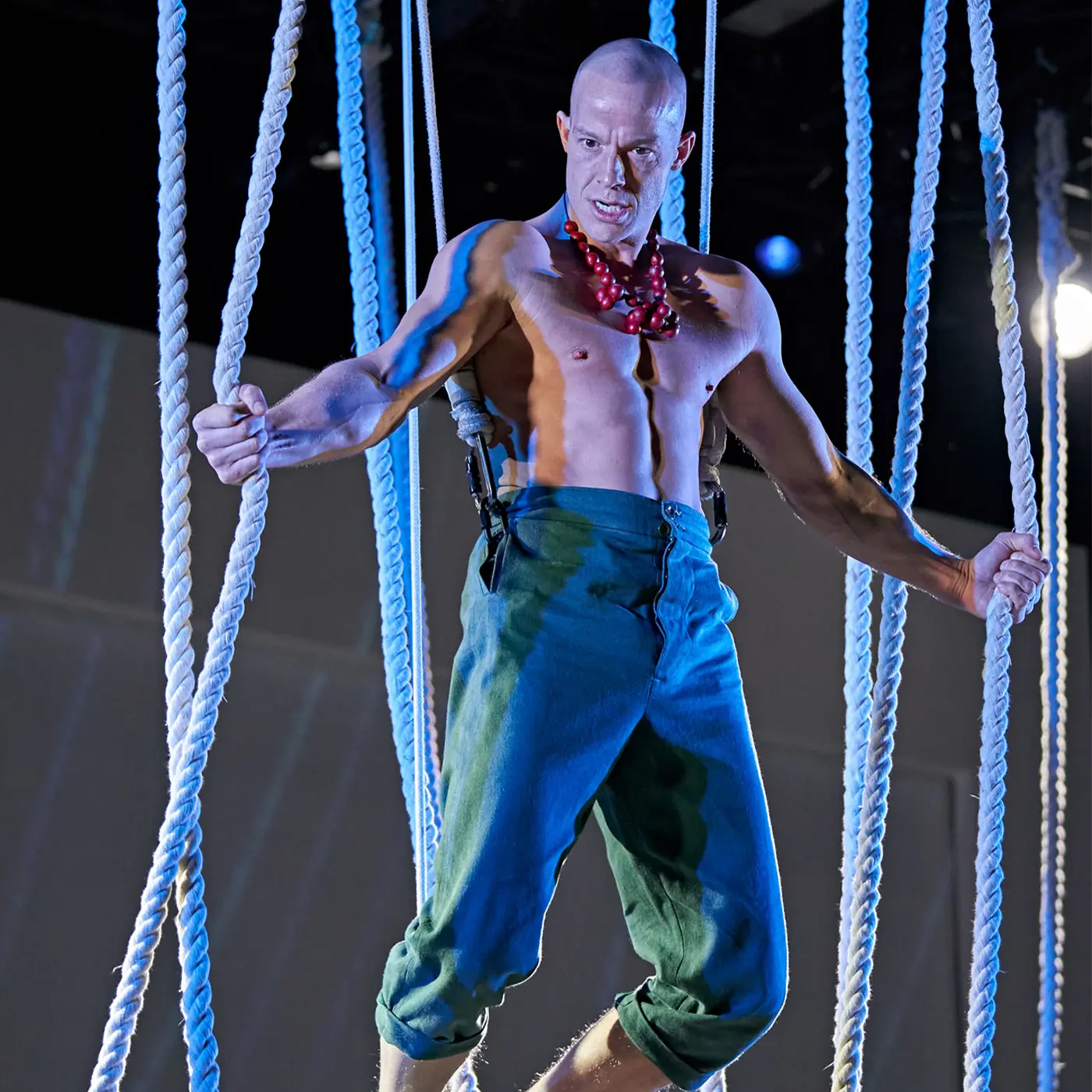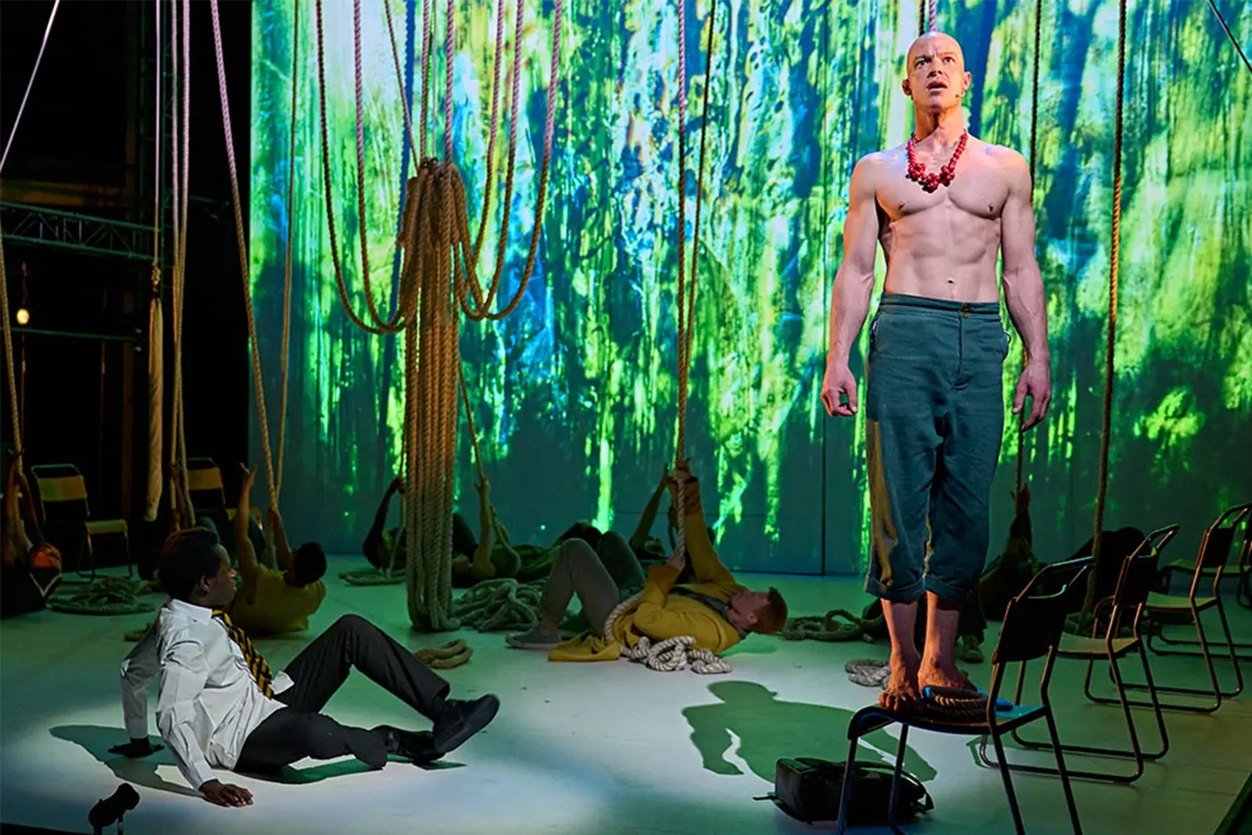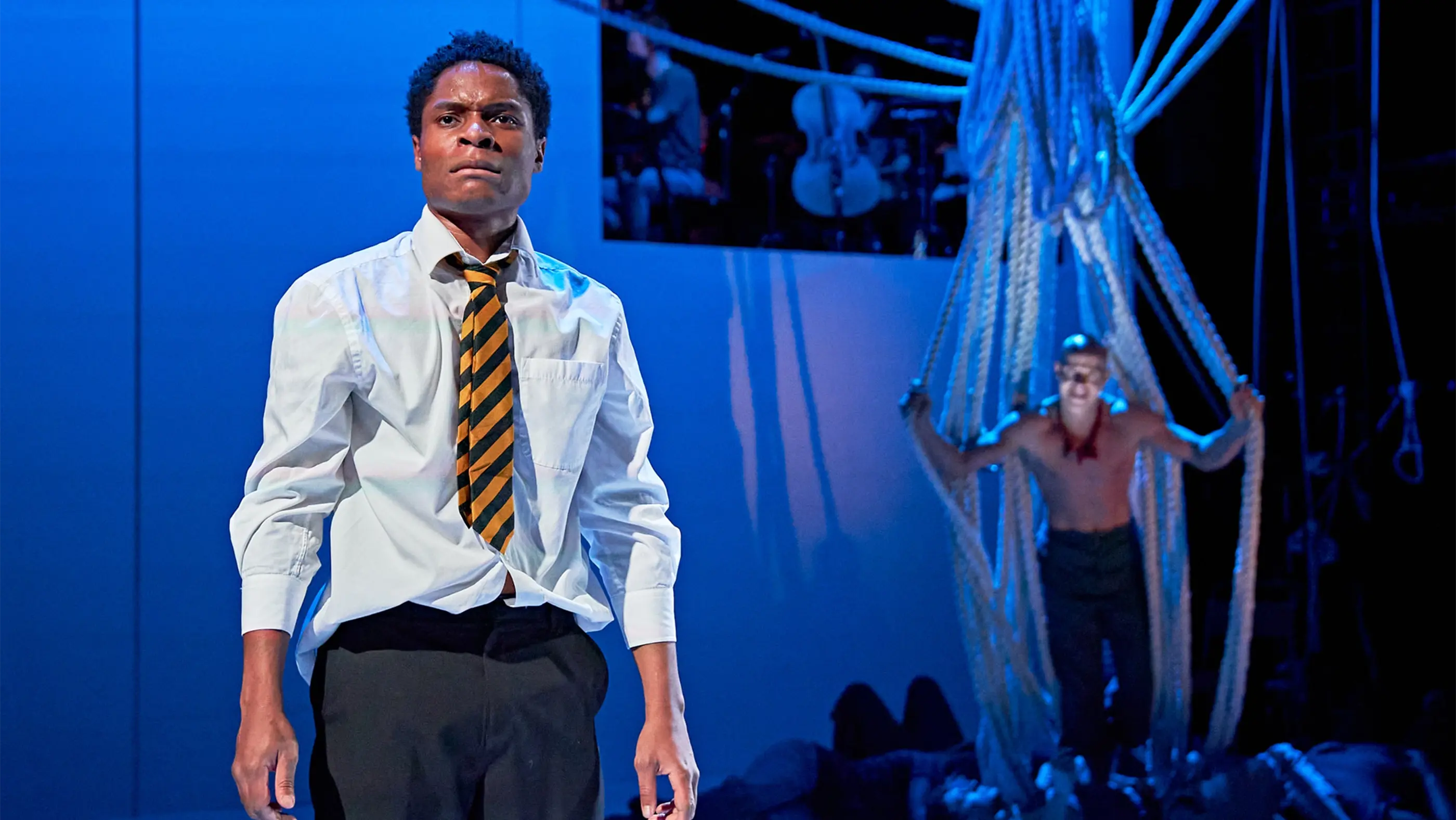 A theatrical performance featuring people interacting with a web of suspended ropes on a stage, with one person in a school uniform at the center and others in casual clothing pulling the ropes; chairs are scattered around, and a screen in the background shows musicians playing cello and double bass under dramatic lighting.
