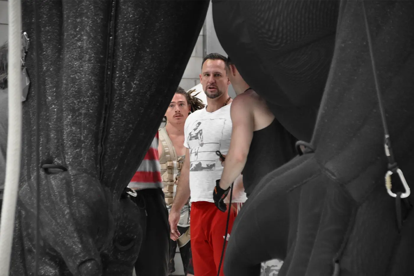 An early decision was to not go down a hyper-real path with Kong, and instead allow for direct manipulation by 11 aerialist/puppeteers named ‘The King’s Men’, two puppeteers offstage operating animatronics via “voodoo” controls and one operating the automation.