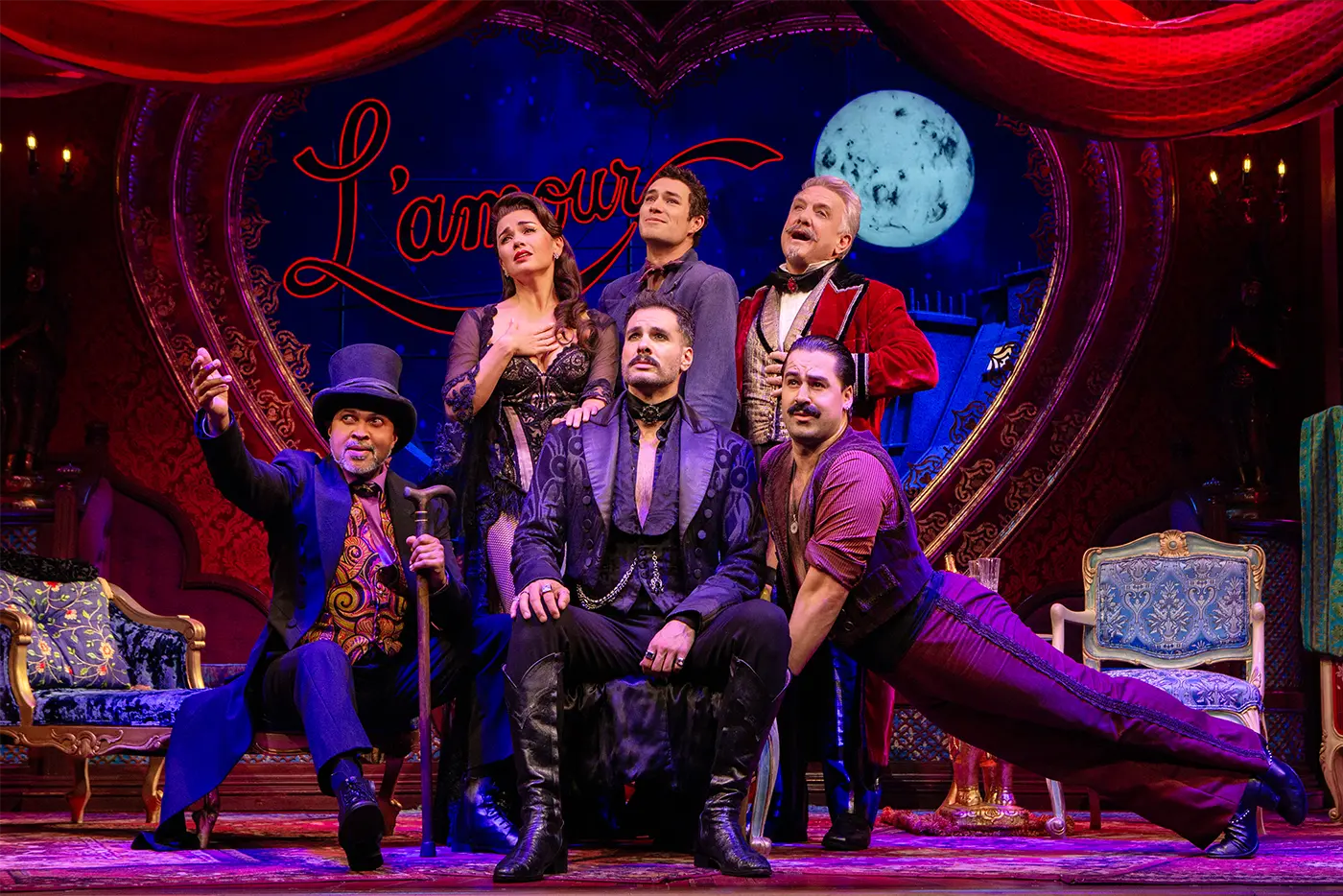 Scene from Moulin Rouge! The Musical Australia during “Backstage Romance,” featuring performers in vibrant theatrical costumes posed dramatically under stage lighting.